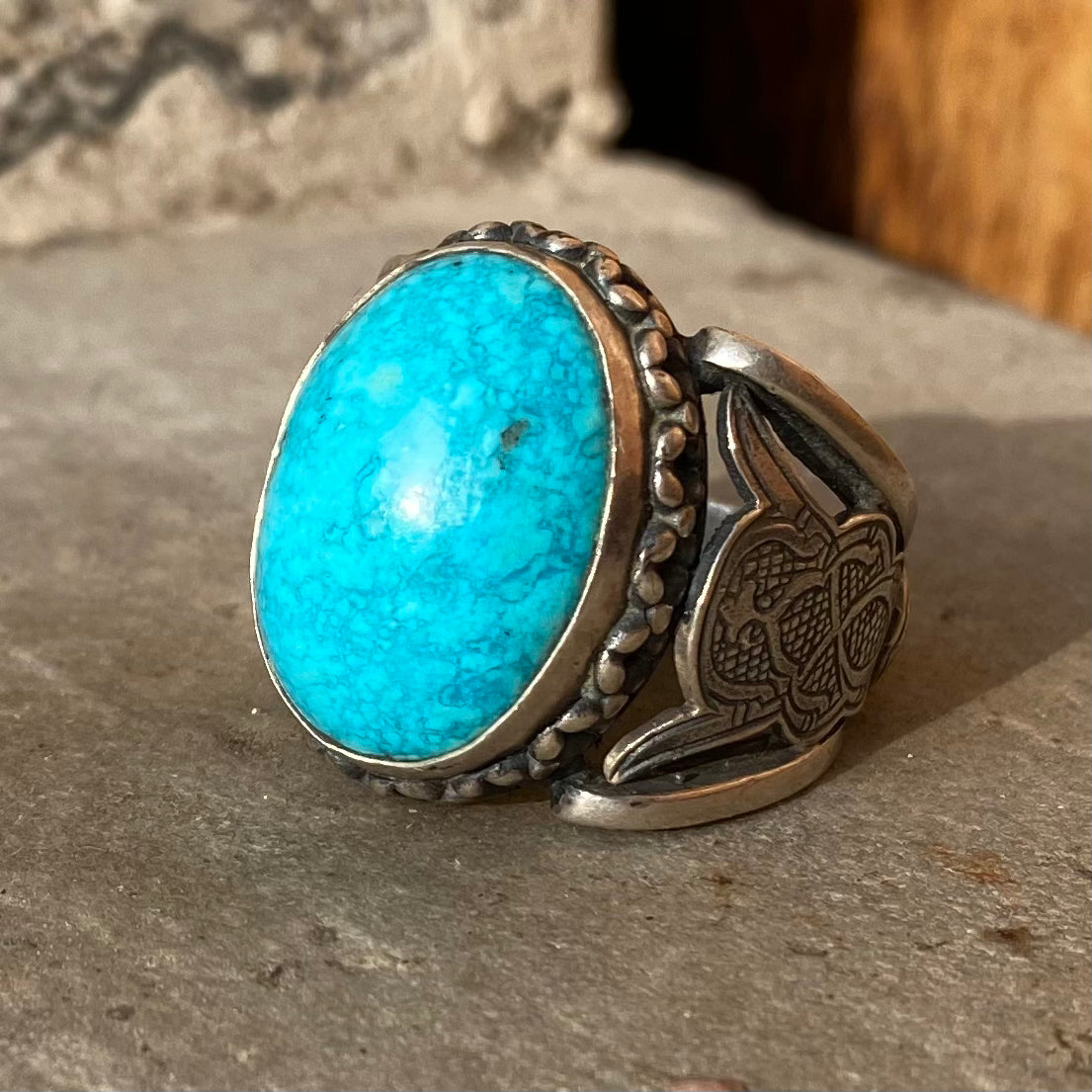 A unique natural large blue turquoise carefully set in a unique handmade sterling silver band crafted by a master silversmith in Türkiye, using traditional methods passed down through generations. The band is shaped and polished entirely by hand, giving every ring a character all its own.